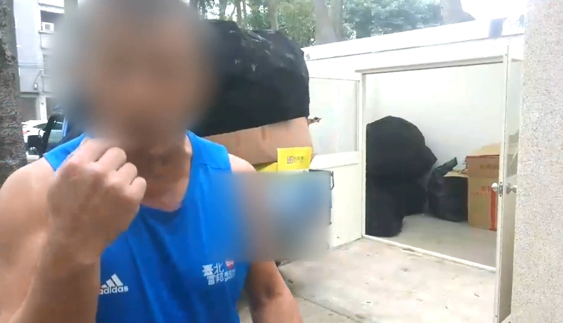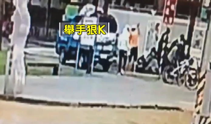 畫面中可以看到,當天穿著綠色衣服的曹先生,走到資源回收貨車後拿出手機拍攝,結果里長老公翁先生走向他理論,曹先生避開翁先生,往貨車右側走去,就在這個時間點,後方的翁先生舉起手狠K曹先生,接著踹一腳,追打補拳。