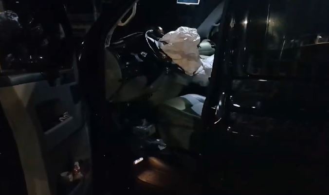 事發第一現場零件散了一地,旁邊的柱子都被撞歪,至於黑色靈車車前頭毀損嚴重,凹的凹、壞的壞,引擎蓋都掀了起來,甚至往車裡一看,連安全氣囊都爆開來,可以想見這撞擊力道應該不小。