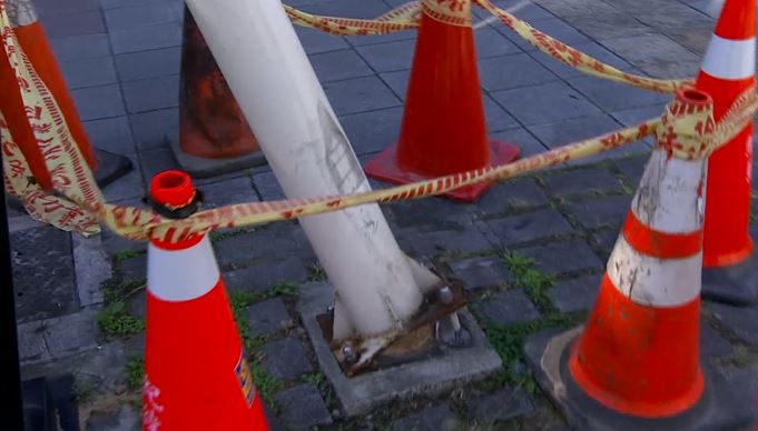 東森新聞記者張炤和:「這一起車禍,到底是怎麼發生的呢?駕駛跟警方供稱,他因為精神不濟,他先撞上貨車,最後是撞上這根桿子才停下來,可以看到這根桿子整個被撞歪了,甚至底座都被掀起來。」