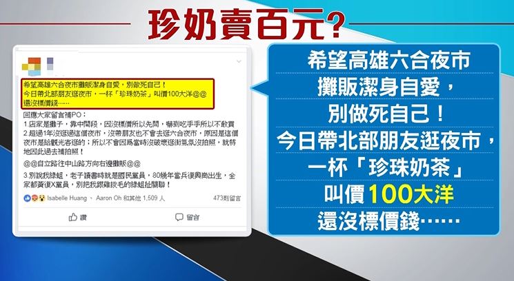 開頭就說,希望高雄六合夜市攤販潔身自愛別做死自己,因為他帶北部朋友逛夜市,一杯「珍珠奶茶」叫價100大洋還沒標價,消息一出,因為文章沒有標出店名和照片引起熱烈討論,有網友表示這些人真不自愛,非得搞死自己害了別人,還有人附和好多店家都不標價,不過更多人質疑沒標價錢又不敢講攤位的,幾乎是來分化的,還有人質疑會不會是假新聞,對其他店家有失公平。