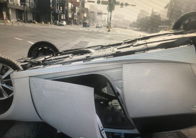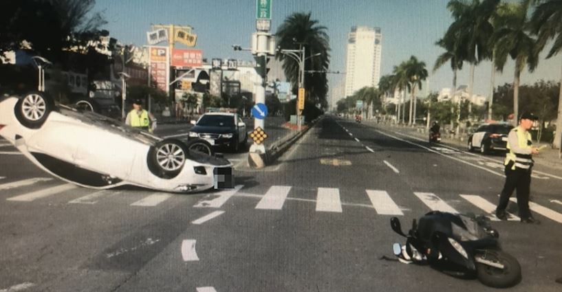 白色轎車行駛在台南中華西路上,沒想到路線卻逐漸往右偏移,撞上了人行道上的圓墩,只見小客車的右側翹起傾斜,下一秒整輛車180度翻覆,沿著斑馬線向前滑行了幾公尺後才終於停了下來,但整起翻車過程中還有一輛機車被撞上,騎士連人帶車摔倒在地,好險他很快地就爬了起來並沒有受到嚴重傷害,但猛烈的撞擊和突如其來的意外,讓一旁停等紅燈的駕駛們全都嚇了好大一跳,紛紛上前關心究竟發生了什麼事,警消獲報也趕緊趕到現場。