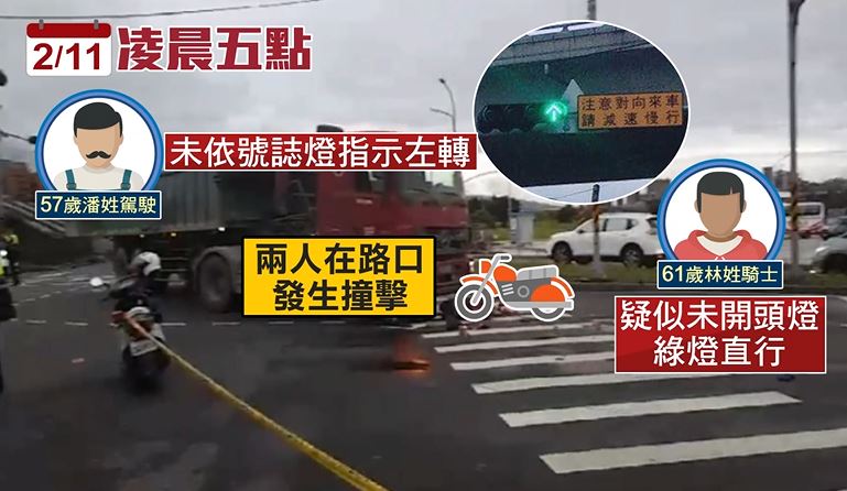 事情就發生在11號,當時交通號誌是箭頭綠燈,57歲潘姓駕駛開著砂石車,沒有依照號誌燈指示就要左轉彎,又疑似因為,61歲林姓騎士沒有開頭燈,兩人直接在路口發生撞擊。