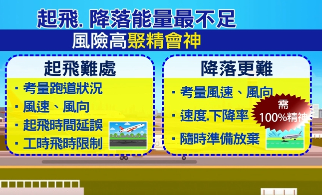 起飛、降落之所以風險高,因為能量都最不夠,還要考量跑道狀況、風速、風向、起飛時間延誤、工時飛時的限制,另外降落同樣也要考慮到風速、風向、飛機速度以及下降率,但也有外界質疑,飛機升上空後就有自動駕駛,機師就可以藉此休息,不過退休飛官澄清,沒有這麼輕鬆。