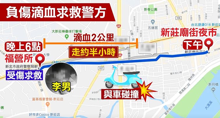 李姓男子供稱的受傷地,就是新北市新莊廟街夜市,這個月下午在這裡摔倒弄傷手,先是到附近派出所請求協助,後來傍晚又自稱在廟街附近與車碰撞,到了晚間六點竟然到福營所求救,走了約半小時,鮮血一路滴2公里嚇壞不少路人。