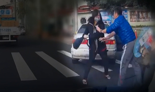 多名學生就在一旁圍觀,一男一女雙方當街爆發拉扯衝突,下課時間國小校門口前一名家長來接小孩,突然拿起皮包對著一名藍衣男子不斷追打,過程中還撞倒了一台停在路邊的粉紅色機車,但仔細看,這名家長就這樣把車停在校門口斑馬線上,明顯違規,而挨打的男子先是抓住了對方皮包,希望她可以冷靜一點,但這名家長火氣很大。