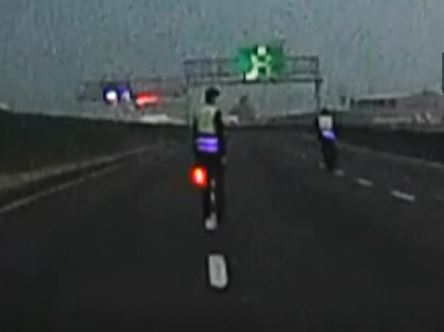 國道七隊警察攔截逆向機車,但騎士往前衝不停車,女警嚇得趕緊跳開,機車差點就要撞上她,天色已經變黑,在這之前,國道員警從傍晚天還亮的時候,為了攔阻機車就啟動人力阻止機車再前進,過程中還有駕駛,開到時速都已經110了還追不上逆向騎士。
