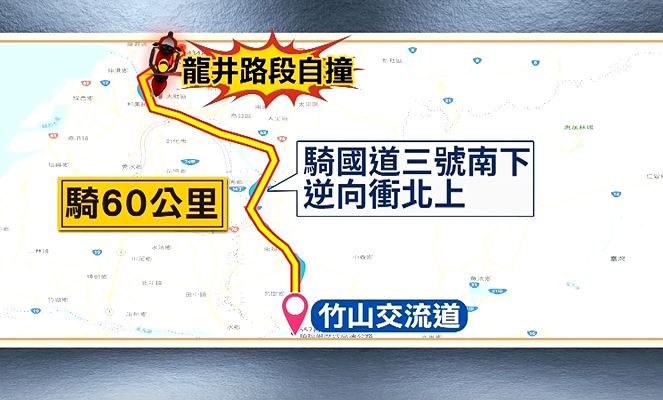 不只人力警方出動多部,警車在國道攔截,但騎士連闖了三關,衝過三道攔截點,途經國道三個分隊轄區,當時車子轟轟轟經過,每一輛車時速幾乎破百,用路人和警方看了都為騎士捏了一把冷汗,調查騎士從竹山交流道,騎上國道三號南下路段,逆向往北上一路飆車,結果到了龍井路段,擦撞多輛自小客後照鏡,自撞摔車左手開放性骨折,一共騎了60公里簡直玩命,送醫之後13日晚間已經開刀完成,騎士逆向上國道動機原因,警方初步了解。