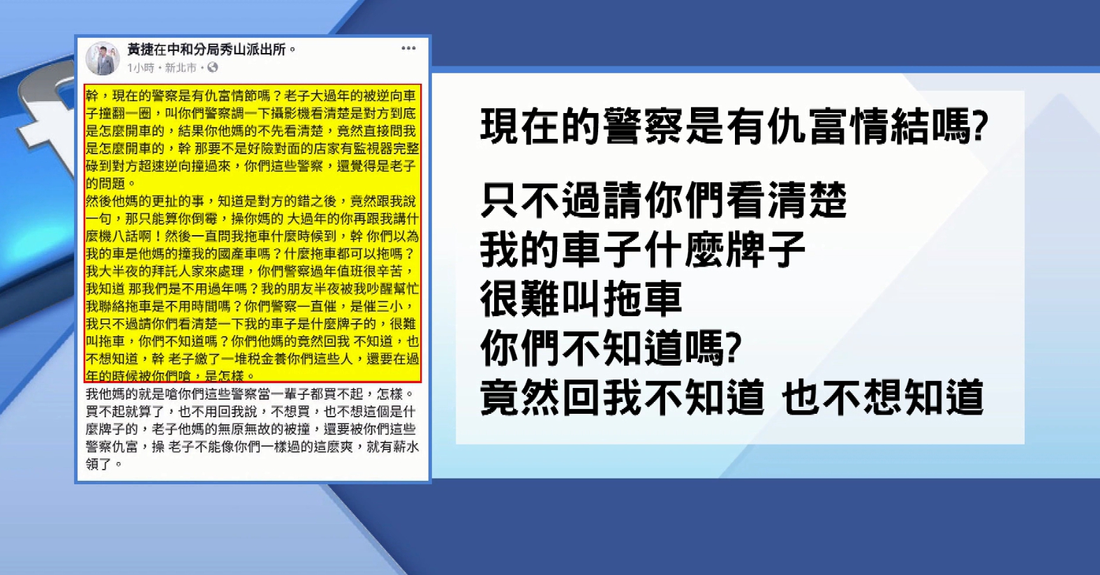 我們詢問賓利車主,但他說人在開會,不便回應,後來致電也沒接電話,臉書關閉,曾經說過,每個人都很辛苦,但愛車被國產車撞壞,讓他情緒失控又嗆警,當一輩子警察都買不起,格外諷刺。
