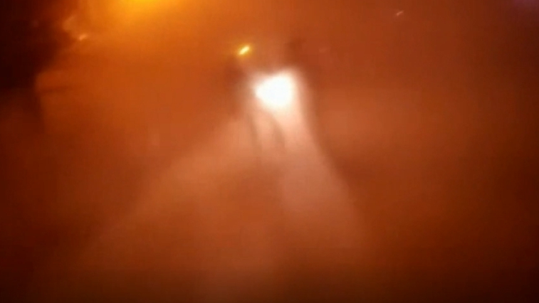 現場煙霧瀰漫,酒醉男子趁著燈光昏暗躲在車子旁邊,冷不防對員警猛噴滅火器,員警雖然被滿臉粉嗆到,還是把男子一把逮住。