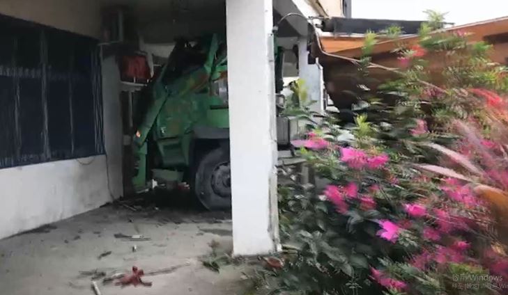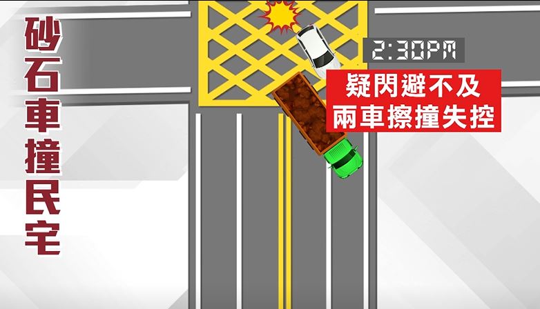原來警方調查,在下午2點半左右,一輛砂石車行經復興路三段時,另一輛小客車,恰好從旁邊的315巷開了出來,砂石車駕駛疑似閃避不及,兩車擦撞後失控,砂石車直接撞進對向的民宅騎樓內。警消到場時,砂石車駕駛及小客車內4人都已脫困,僅受到輕傷,據了解雙方駕駛酒測值都為0。
