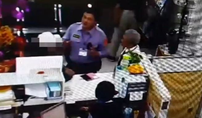 兩名銀行行員、一名員警圍在婦人左右,3人一同開導。