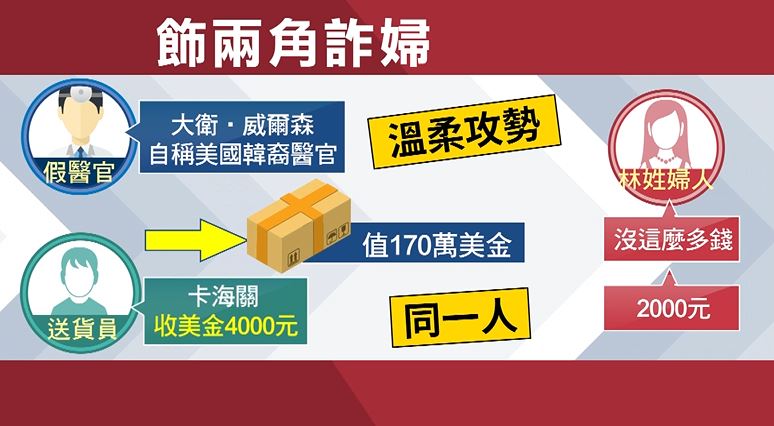 2000元也是錢,櫃台女行員直言對方收到錢就會消失,經過苦苦相勸,林姓婦人自稱在臉書上,遇到一名美國韓裔醫官大衛威爾森,他說要寄一個價值170萬美金的包裹當作見面禮,可是因為被海關卡住,需要支付美金4000元才能收到這份大禮,相當於12萬新台幣,婦人表示沒這麼多錢,只有2000元,陷入假醫官的溫柔攻勢,完全不曉得對方是同一人。
