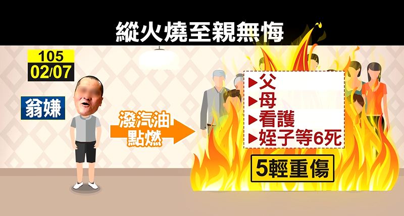事發在105年除夕夜,他認為父母偏心不重視他,竟然縱火燒親友。犯案後逃了5天落網,嫌犯自己臉部也燒傷留下大片傷疤,當時他趁16名親友,圍爐吃年夜飯時突然在住家外,以及對親友們潑灑20公升汽油再點燃,全家瞬間陷入火海,其中年邁父母、看護、兄嫂、姪子等6人來不及逃生,葬身火窟,包含自己一共造成5人輕重傷。