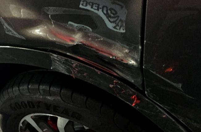 ▼百萬跑車海神疑搶快,車子遭擦撞。(圖/東森新聞)