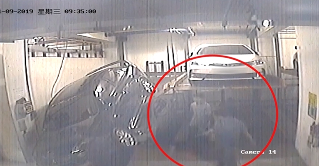 大樓地下室的監視畫面,看到機械停車位的施工廠商在牆邊操控按鈕,只看到他按了一下後,上層的停車位突然間崩塌,朝黑色自小客重壓下來,操控人員及時跳開才沒有被壓到,另一人看到突發的意外也嚇呆了,這時在停車位後方的工作人員衝了出來,大家手忙腳亂的想辦法處理。