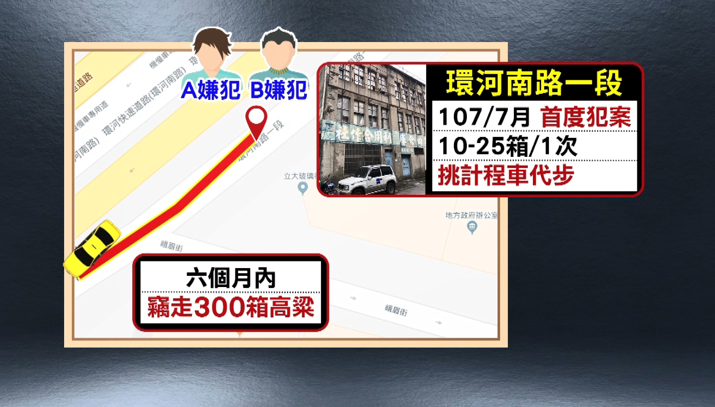 案發當下沒畫面,到底該怎麼追?警方開始擴大調閱監視器,找到了破口,發現嫌犯不止1人,而且不是單次犯案,從去年7月,嫌犯首度犯案,每次都偷走10到25箱高粱,還刻意挑選計程車運送,躲避查緝,短短6個月內,竊走300箱高粱,等到被害人1月多發現時,早就搬光光。