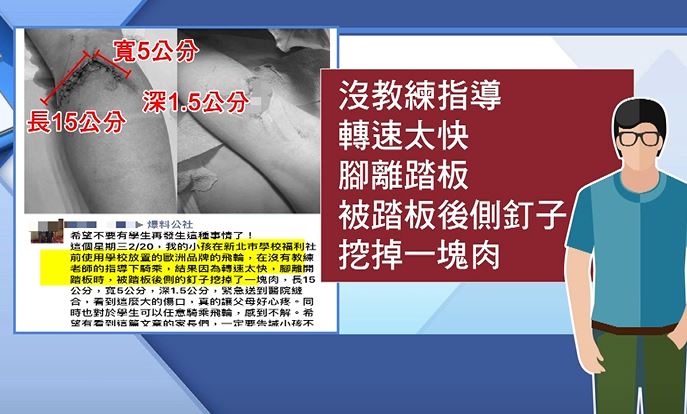 記者吳欣倫:「一名學生家長在臉書上指控,他的孩子這所高中的福利社前踩飛輪,沒想到因為轉速太快了,導致小孩的小腿被削了一塊肉下來。」