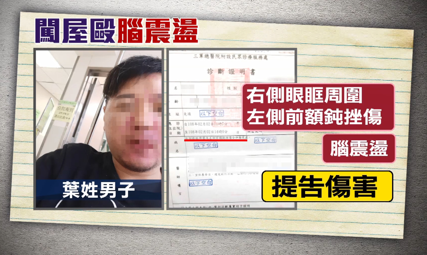 原來當時,葉姓男子女兒的生母要行駛探視權,來到家中接小孩,同行的男友人,被指控出拳毆人,葉姓男子也緊急送醫,驗傷單寫到他的右側眼眶周圍,還有左側前額都有頓挫傷,還有腦震盪的現象,讓他氣得報警提告,而且最令他不滿的是,打人男子動手前,竟然還在他的車庫丟了一包白包。