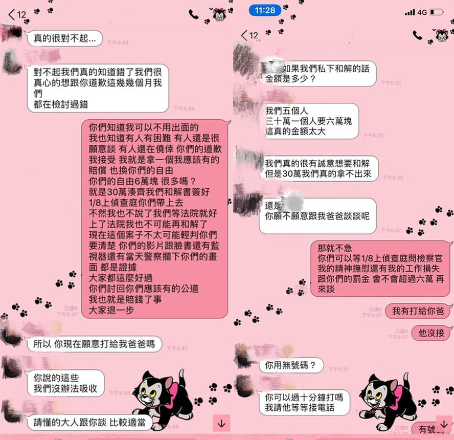 儘管官女矢口否認,卻還是慘遭一陣痛毆,陳女等人的行徑相當惡劣,不僅將官女及腰的秀髮剃成3分頭,還向她潑水後再電擊,甚至將她的衣服脫光,強迫她穿上女僕裝拍下影片和照片PO網,凌虐時間長達30分鐘,事後5女遭警方傳喚也從不到場,沒人將此事放在心上,直到法院傳票寄到家中,她們才驚覺事情大條了。