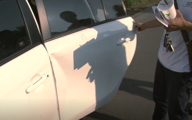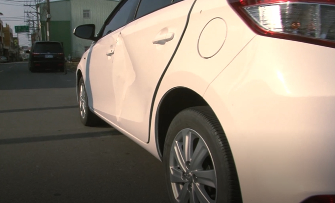 ▼白色小客車被撞到車門凹陷(圖/東森新聞)