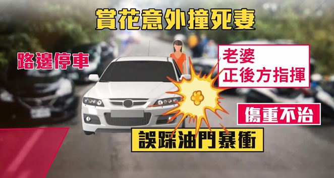昨(1)日下午,台北市一對夫妻載著家人到貓空杏花林賞花,抵達賞花地點要停車,老婆先下車在轎車正後方幫忙指揮,但先生不小心打錯擋還踩到油門,往後暴衝撞上老婆,當場沒有生命跡象,搶救仍宣告不治。停車卻意外撞死老婆的先生,當場情緒激動崩潰下跪,雖然沒有殺人意圖,但仍被警方依過失致死移送偵辦。