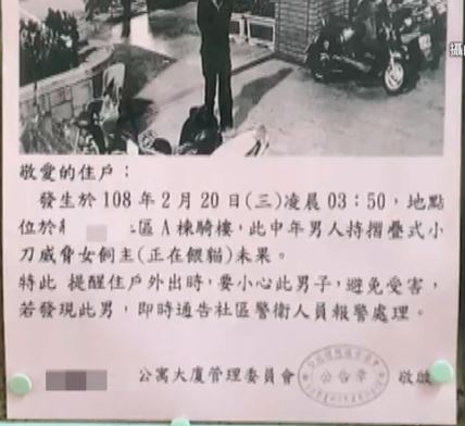 社區大樓張貼廣告,監視器截圖裡,一名黑衣男子站在大樓外,眼睛盯著蹲在地上的女子,公告寫的驚悚,說男子持刀械隨機暴力恐嚇,事發在新北市蘆洲這棟社區大廈,女住戶好心餵養流浪貓,卻不知道嫌犯就在背後虎視眈眈。
