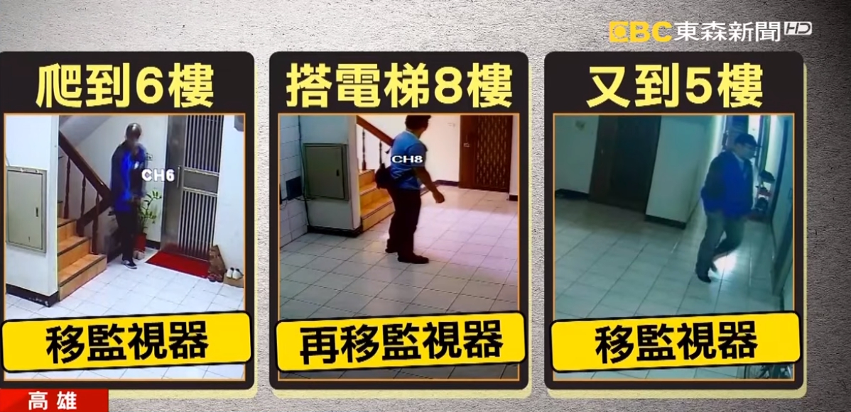 保全指證歷歷,因為黃姓男子不只移6樓監視器,就連8樓他也搭電梯去移,還有5樓也遭殃,幾乎整棟樓的監視器都被他喬過,從另一段監視器畫面一看,不得了,原來他喬過監視器後,竟然還闖5樓空門,還有租客嚇到連夜搬走。