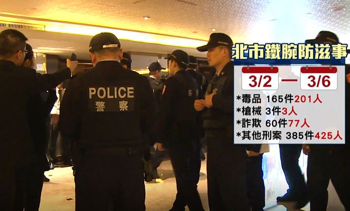 從2號到6號期間,台北市動員超過2200名警力,前往369處臨檢外,還執行1717處路檢,過程中查獲165件毒品案共逮捕201人,非法持槍部分則是共3件3人,另外,查獲詐欺案60件共逮77人,其他刑案則是385件一共逮425人,北市警方,這波鐵腕執法在228假期結束就開始。