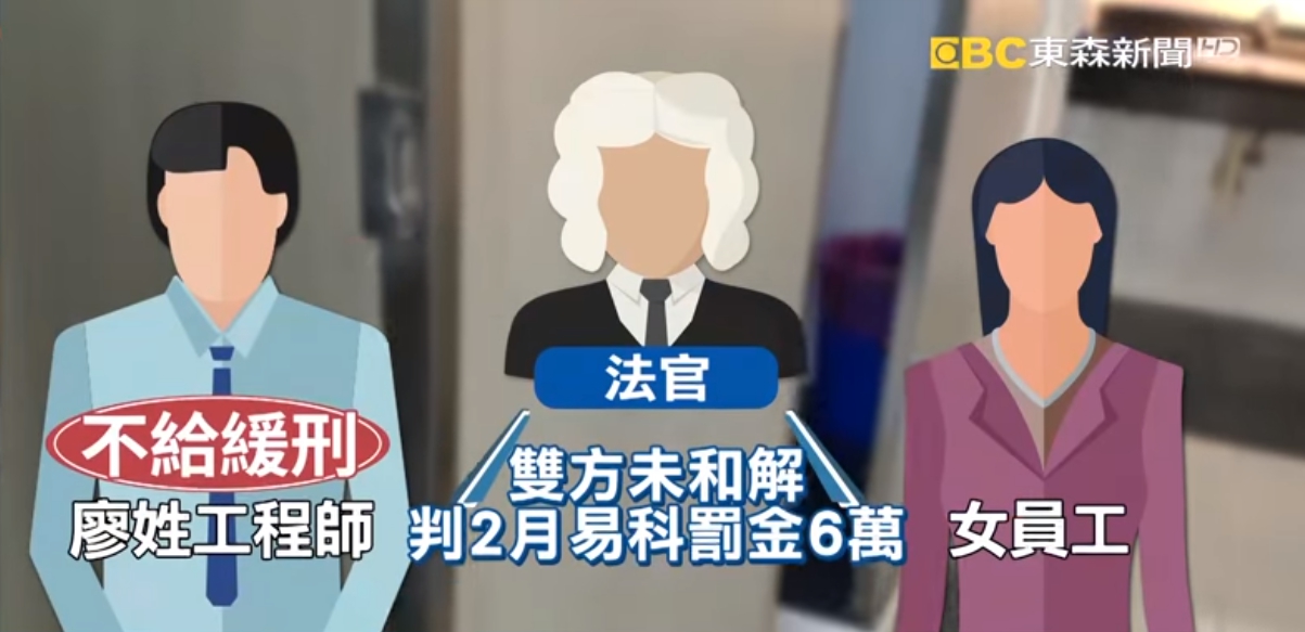 32歲的廖姓工程師,供稱是因為工作壓力太大,才會偷拍,並向對方要求和解原諒,不過女員工認為他身心受害,就連法官問她,要不要給予嫌犯緩刑,她都拒絕,最後法官判刑2個月,易科罰金6萬。