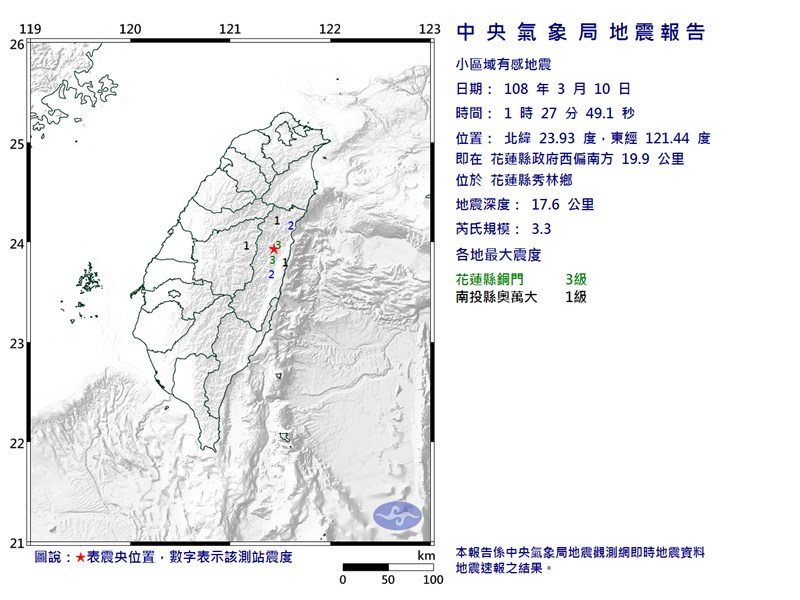 根據中央氣象局最新資訊,10日1時27分發生芮氏規模3.9地震,地震深度19.8公里,震央位於花蓮縣政府西偏南方18.2公里(位於花蓮縣秀林鄉),最大震度花蓮縣4級。