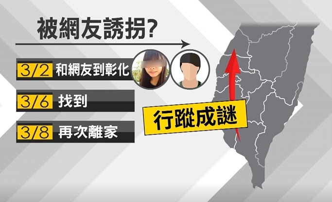 方姓少女爸媽離異,就讀高一,跟媽媽一起住在台南,疑似跟媽媽起爭執,不想住在一起,這個月2號跟網友離家,爸爸報警協尋,最後在彰化找到人,連同男網友一同帶回屏東恆春,沒想到8月又不見人影,行蹤成謎。