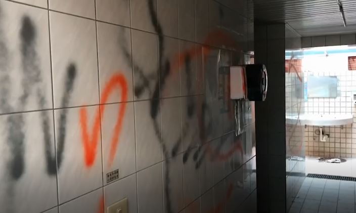 遭砸第一現場帶你看看,一進到廁所裡簡直慘不忍睹,所見之處幾乎都被亂噴漆,一連好幾個馬桶被砸爛外還用泡棉塞住,相當惡劣,不僅連隔間都被拆了洗手台也遭殃,整間廁所能砸的能拆的通通沒放過,初步維修費就超過5萬元以上。