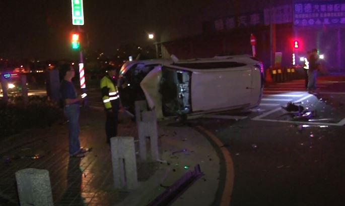 深夜時分,白色休旅車側翻十字路口,車上陳姓駕駛一度受困,人被救出來後坐在擔架。
