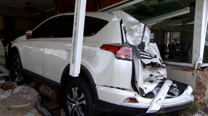休旅車停在烤鴨店側邊,烤鴨還沒等到,突然尖叫聲四起,一陣天搖地動後,休旅車駕駛下車查看,不敢相信眼前景像,車子衝破烤鴨店牆壁,直到撞毀工作台才停下來。