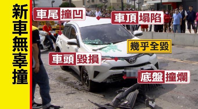 駕駛一臉無奈,這部車過年前才花80幾萬買的,原本想說開Uber賺點錢,載著客人到高雄知名的仁武烤鴨朝聖,結果莫名其妙被水泥車撞,底盤撞爛、車尾撞凹、車頂塌陷,就連車頭也毀損,整部車幾乎全毀。