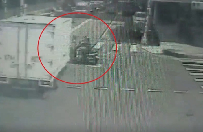 駕駛驚覺撞到人,緊急剎車,這時騎士連人帶車被撞飛,這猛力撞擊,機車當場支離破碎,車殼零件噴飛四散,透過另個角度來看,當時機車騎士被攔腰撞上,這一撞,當場倒地不起。
