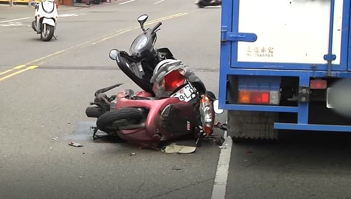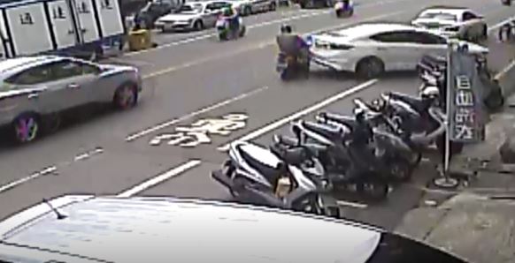 超驚悚的一瞬間,想要倒車疑似誤踩油門,機車騎士完全閃避不及,後方還有一台休旅車經過,騎士跟摩托車被撞就成了夾心餅乾,被兩車夾擊重重摔落在地,而對向車道另一台機車也躲不過。