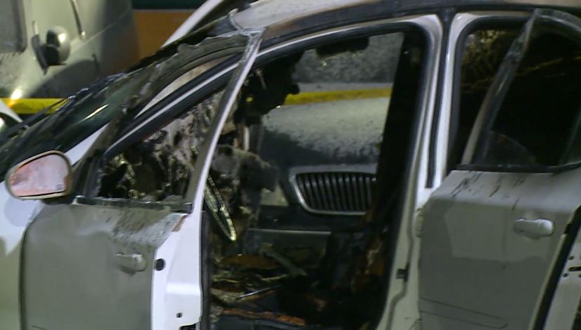 ▼白色轎車內外遭信號彈燒到燻黑。(圖/東森新聞)