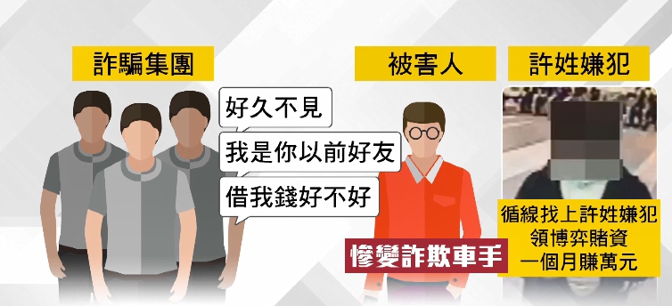 整起抓車手案件就發生在台北市松山區,警方事後清查,詐騙集團先找上被害人,用的是老梗的詐騙手法,說是好久不見的好友要借錢,之後再設局找上這名許姓嫌犯,說幫忙提領博弈的賭資,就能一個月輕鬆賺好幾萬元,誰知道竟然變成詐欺車手。