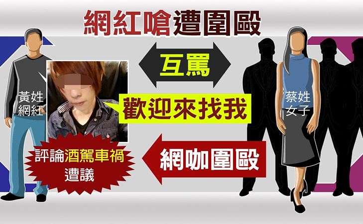 一名黃姓網紅,2016年間在新竹網咖被多名惡煞圍毆,事後他向對方提起傷害、恐嚇、誹謗等罪,原來這名網紅,是因為總是以偏激字眼評論時事才會成名,因為評論酒駕新聞,和死者友人爆發爭執,對方氣不過夥同友人痛毆。事後檢方對動手嫌犯提出傷害公訴,其他罪嫌均不起訴。