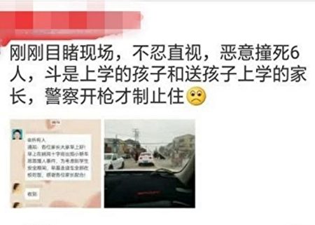 綜合陸媒報導,一名男子在太平鎮姚崗街,與人爆發激烈肢體衝突,隨即當街搶車,蓄意開車衝撞人群。曝光的畫面十分駭人,許多受害者都倒臥在血泊中,醫生也緊急到場醫治,但仍有6人不幸身亡,另外受傷的7人目前已經送醫治療,而警方到場後也已經將男子擊斃,死傷者多為學生及送孩子上學的家長。