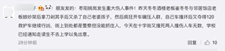 事發地點附近的小學已經通知該校學生及家長,若是走路上學要特別小心,以免又發生憾事,老師也在家長群組裡發出消息,提醒大家小心。一名網友轉發朋友的消息,透露該名男子事先殺了自己的妻兒,接著開車輾壓人群,再搶救護車行兇,還沒有警察抓得住他,且男子昨(21)日晚間就和鄰居老闆娘發生衝突,不料今日又上街撞人,而詳細案情還有待警方調查釐清。