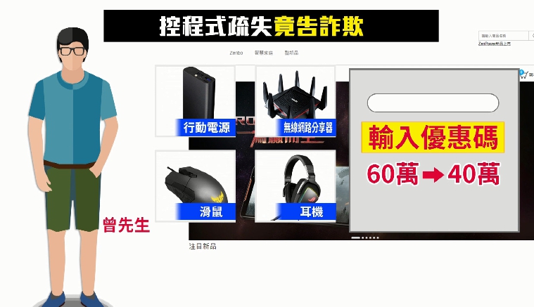 曾先生強調自己不是駭客,只是按照程序購物,沒想到被提告詐欺,從去年11月開始,曾先生從官網上陸續訂購行動電源、無線網路分享器、滑鼠、耳機等商品,接著輸入活動取得的優惠碼,兩個月期間買了100多件商品,下單總金額從60萬降到只要40萬元,事後華碩驚覺有異,趕緊向警方報案,提告詐欺。