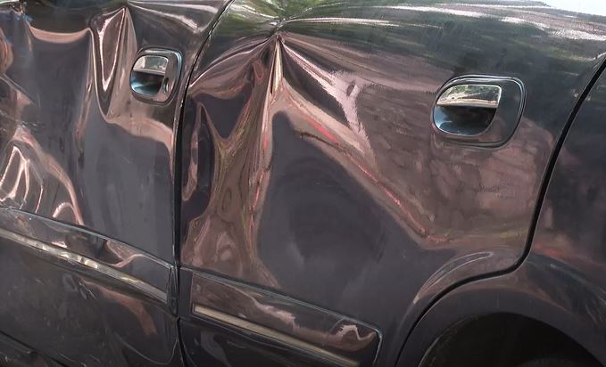 ▼遭撞擊的黑色轎車側面板金嚴重凹陷,可見撞擊力道相當大。(圖/東森新聞)