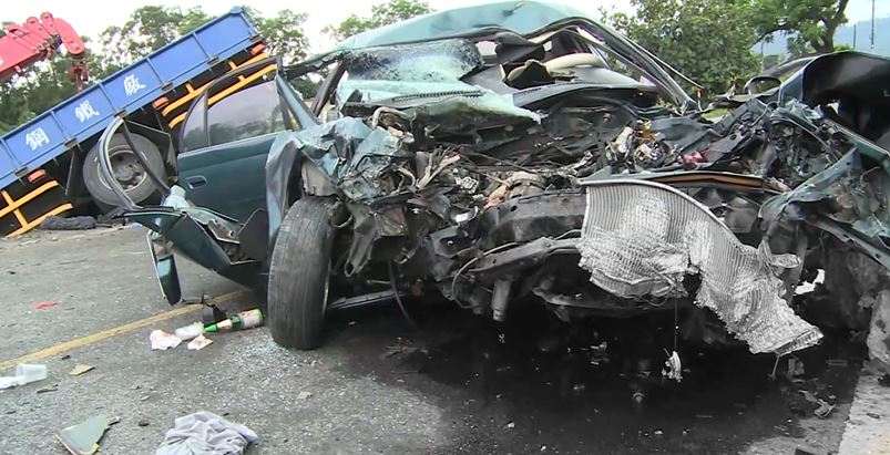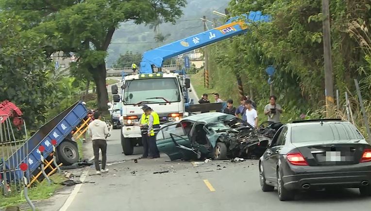 轎車面目全非零件碎片噴散一地,一旁的大貨車則是卡在馬路邊坡,27日下午2點多,宜蘭縣礁溪鄉發生對撞事故,疑似是因為轎車逆向超車,又速度過快才會發生車禍。