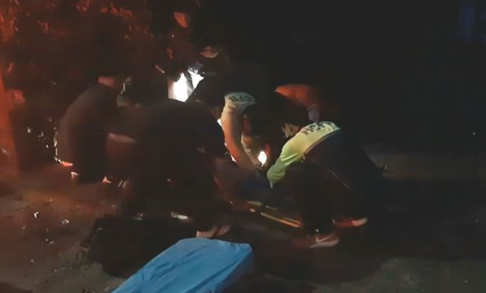 男子不停慘叫哀嚎,因為他剛騎機車,摔落3公尺的邊坡,讓他痛不欲生,救護人員抵達,趕緊用背板將他固定,再抬到擔架上前往醫院急救。