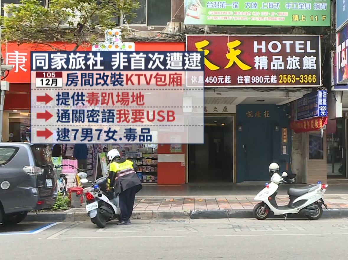 過去,業者曾把房間改裝成KTV包廂,提供毒趴場地,還設定通關密語「我要USB」,當場被警方查獲毒品,跟14名吸毒男女。