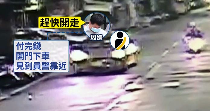 ▼周嫌原本要找朋友,但下車後見到警察不敢下車,催促司機往前開。(圖/東森新聞)