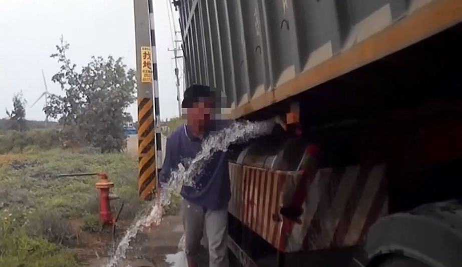 這名砂石車司機29號上午開車出勤,到苗栗後龍的台61線跟苗33線路口,看到消防栓就拿出專用的板手和水管,把裡面的水都裝進車子的水箱裡面,說是為了煞車用的冷卻水,但這詭異行為被民眾報案,警方當場抓到他偷水行為。