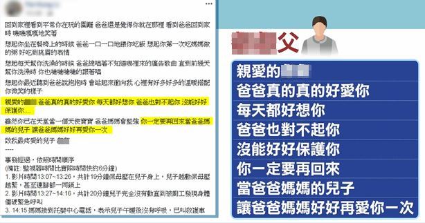 男嬰的父母親,也在臉書上po文,母親沉痛地寫下,老天爺在4月1號,開了很大的愚人節玩笑,早上還笑咪咪的小天使,卻跟我永遠道別,覺得是個夢,直到醫生表示急救60分鐘,無生命跡象,不得不承認這個夢,希望永遠醒不來。父親也寫下,親愛的oo,爸爸真的真的好愛你,每天都好想你,爸爸也對不起你,沒能好好保護你,要再回來當爸爸媽媽的兒子,讓爸爸媽媽好好再愛你一次,字字句句,道出為人父母的不捨,只盼望檢警,能調查出真相。
